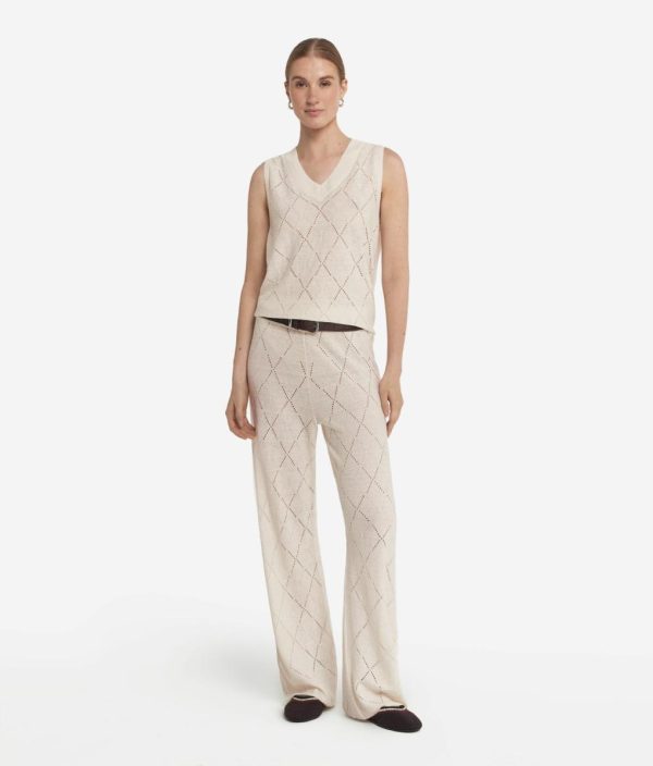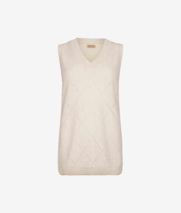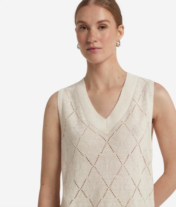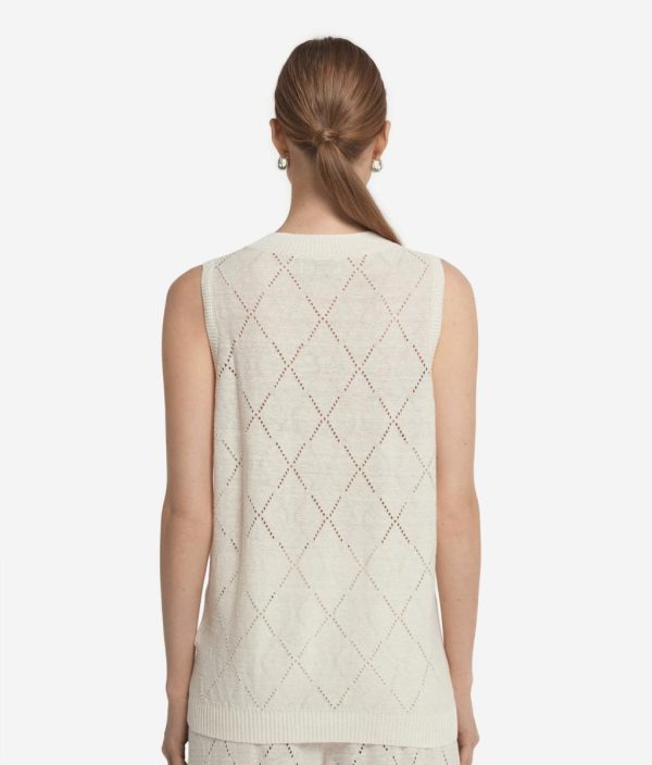 Leggera e femminile, questa canotta con scollo a V è realizzata in un pregiato mix di lino e cotone, perfetta per le giornate più soleggiate. La lavorazione a punto traforato disegna delicati motivi a rombi che giocano con la trasparenza, donando un tocco arioso e raffinato. I fondi a costine aggiungono struttura e definizione a questo capo, ideale per look estivi e dall’eleganza naturale.