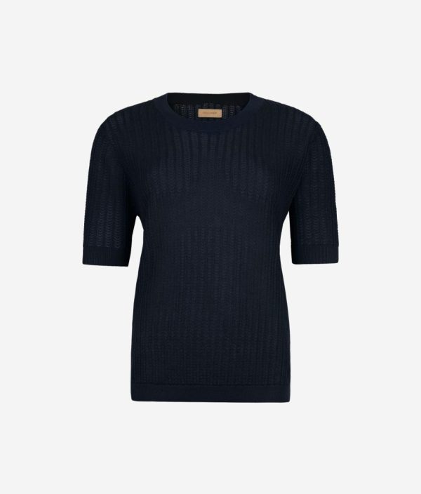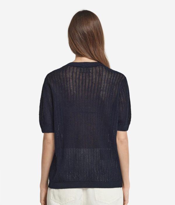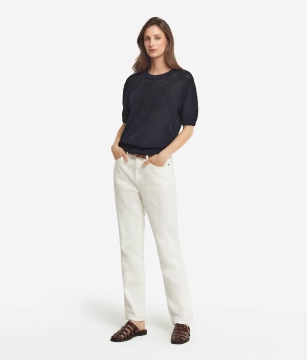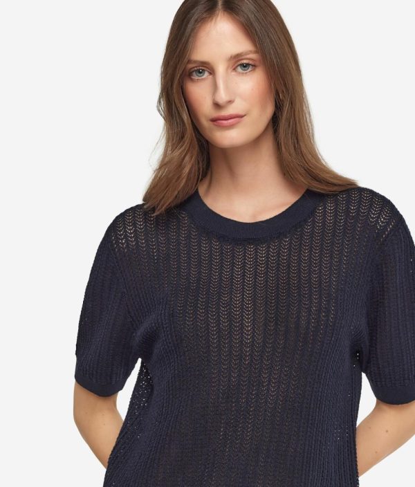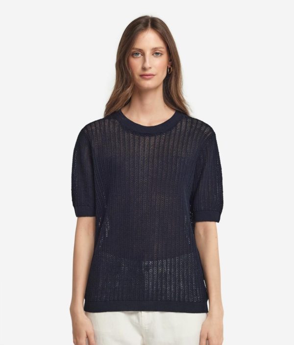La delicata lavorazione a costina traforata e la leggerezza del filato naturale esprimono l’anima rilassata e ariosa di questa T-shirt in cotone e lino. La spalla leggermente scesa e la lunghezza ai fianchi disegnano una silhouette morbida, fluida e spontanea, ideale per chi cerca bellezza e romanticismo in ogni look quotidiano.