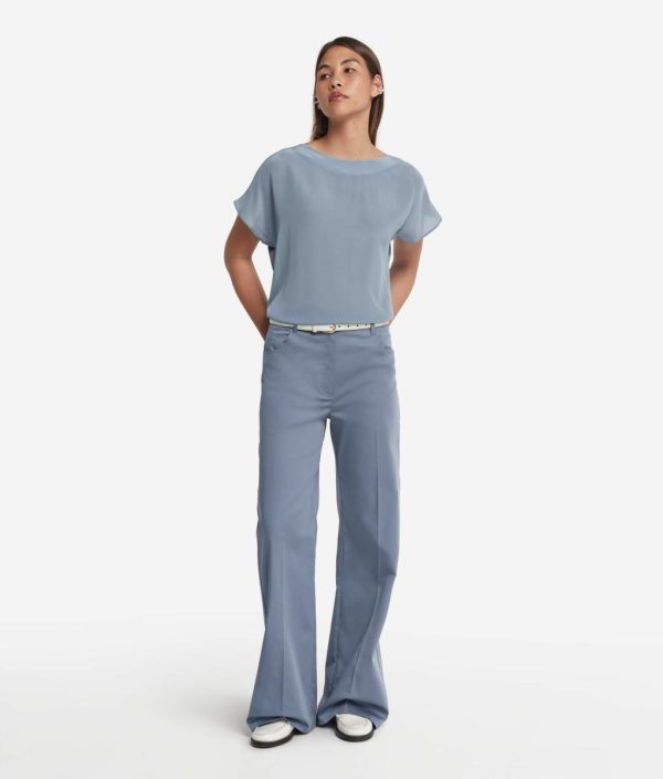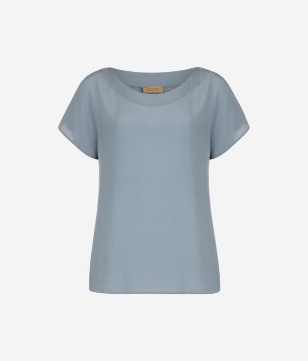 Equilibrio nelle forme e nei volumi caratterizzano lo stile della collezione Falconeri che da sempre armonizza lo stile alla naturalezza dei materiali. L’impiego della seta si coniuga sublimamente con le morbide forme di questa t-shirt con scollo a barchetta e maniche a kimono in crepe de chine nella parte anteriore e modal sul retro. Maglia versatile e raffinata del guardaroba femminile, ideale per completare con eleganza i look quotidiani.