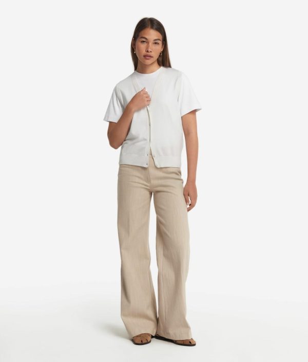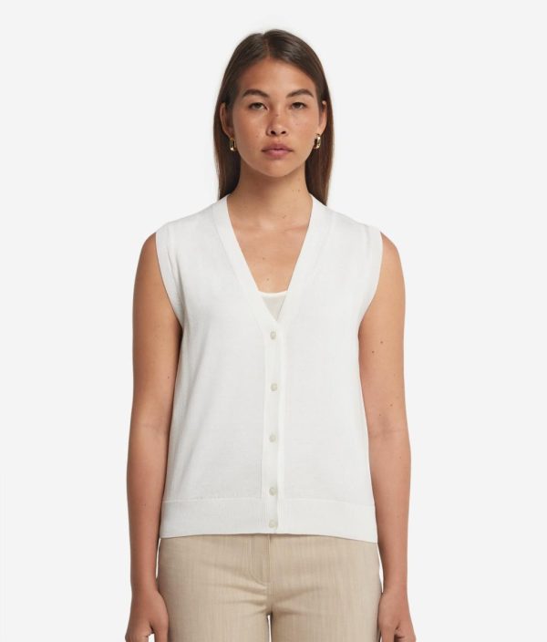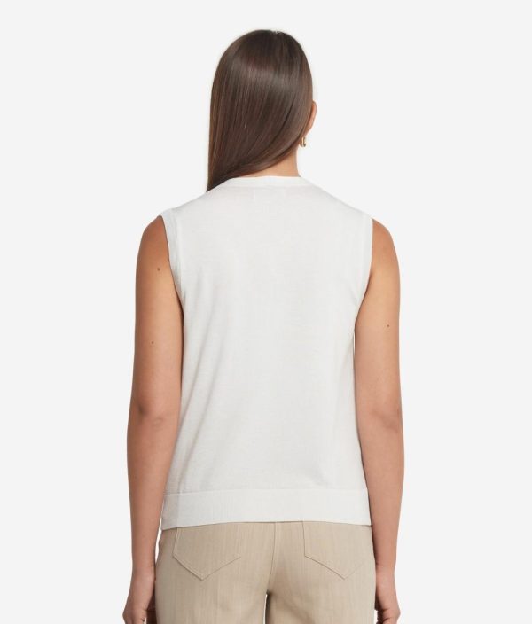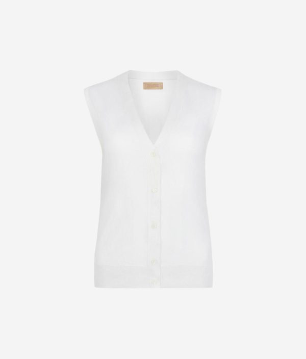 Caratterizzato da un classico scollo a V e una chiusura frontale con cinque bottoni, questo gilet in seta e cotone è perfetto per un look elegante e sofisticato. Le finiture a costa su scollo, spalle e fondo aggiungono un tocco di ricercatezza, valorizzando il design essenziale ma curato del capo.